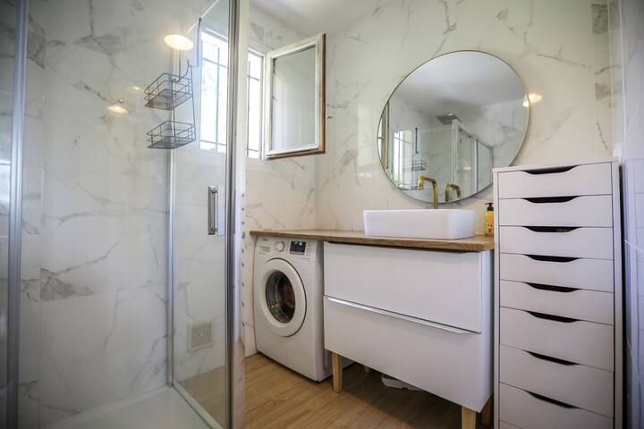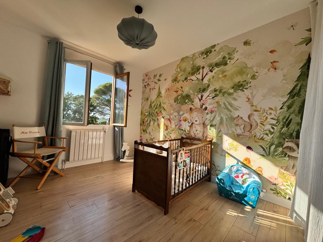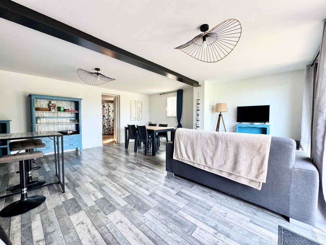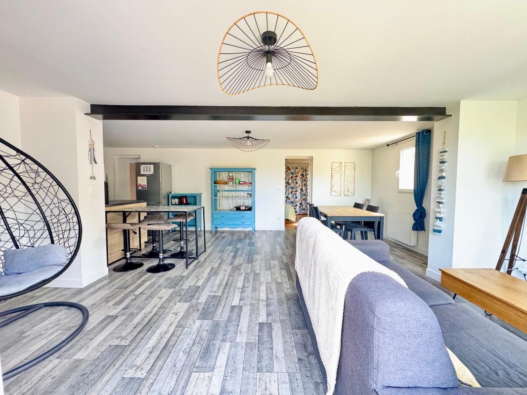 A l'étage sur une une surface de 100m² elle est composée d'un spacieux séjour avec cuisine américaine adjacente, meublée et équipée de façon moderne, 3 grandes chambres avec placards, une salle d'eau, un WC et enfin une terrasse de 20m².