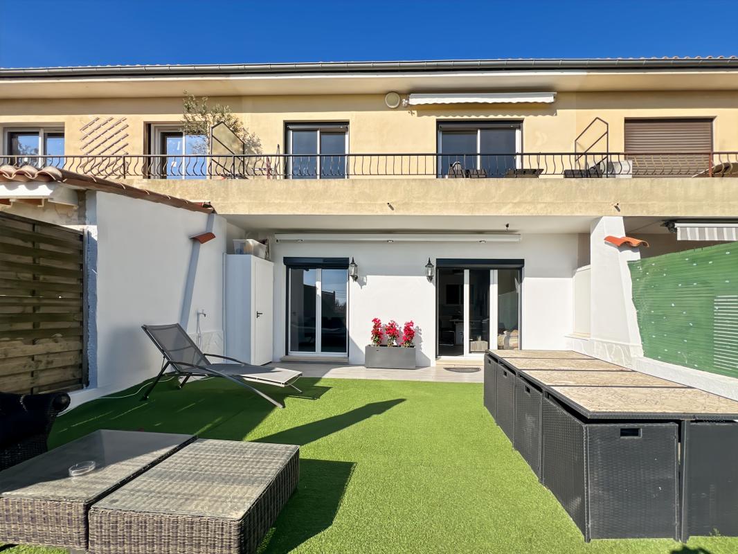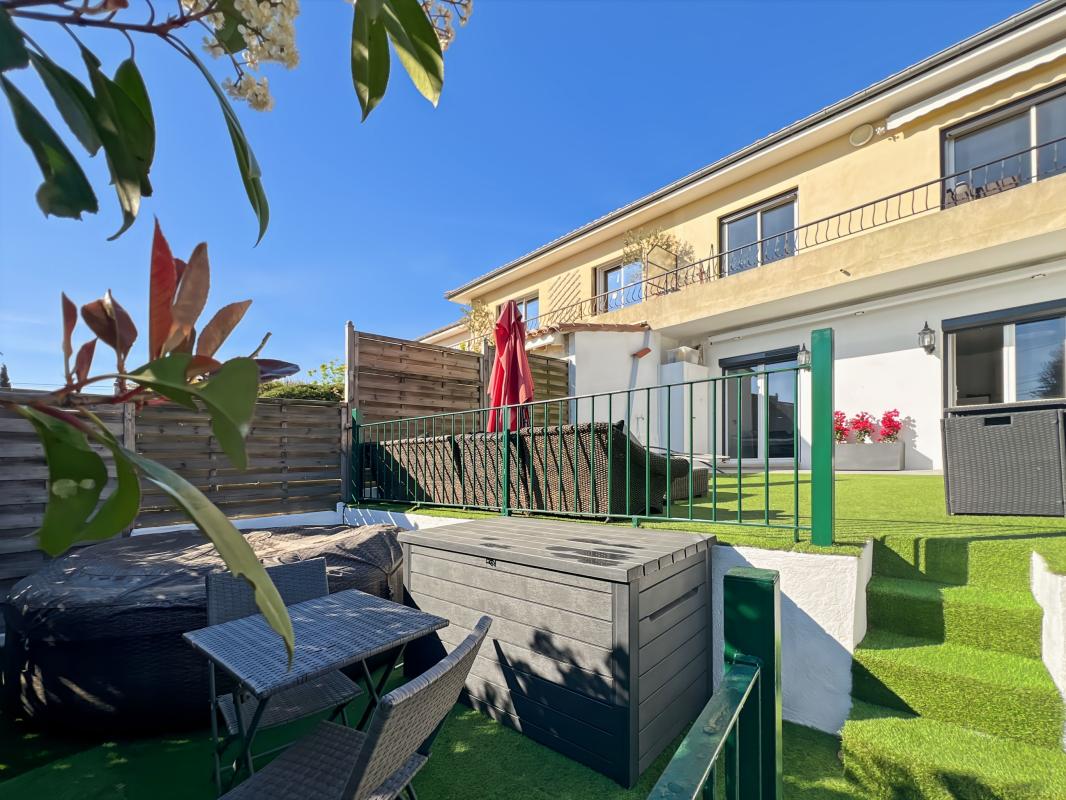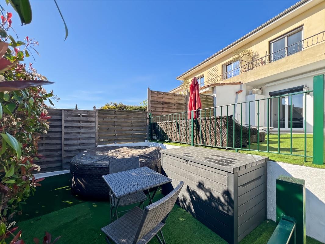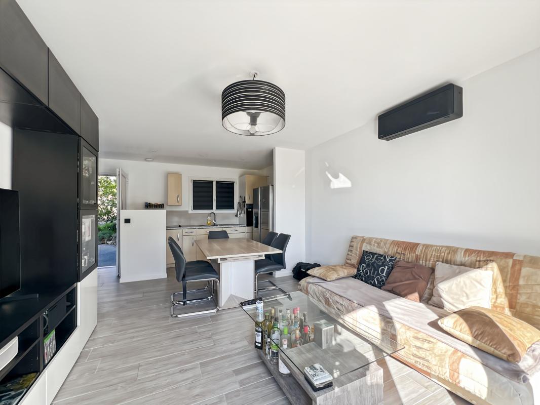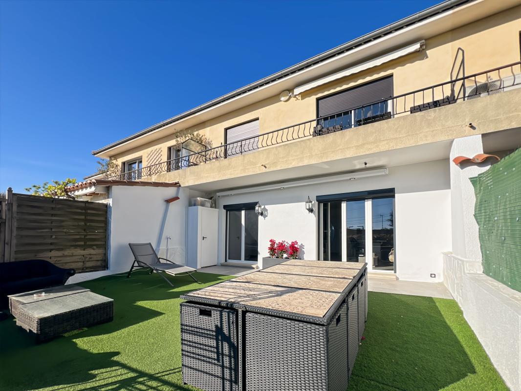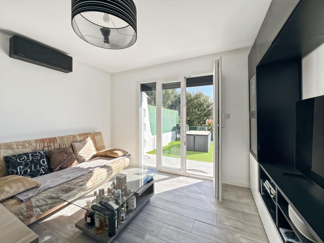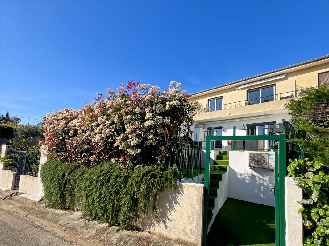 Secteur résidentiel au calme absolu avec aperçu mer. Dans une petite copropriété, charment 2 pièces de 40m² en RDC rénové avec entrée, salle d'eau, wc, chambre, cuisine ouverte sur séjour donnant sur grande terrasse de 60m² avec aperçu mer.