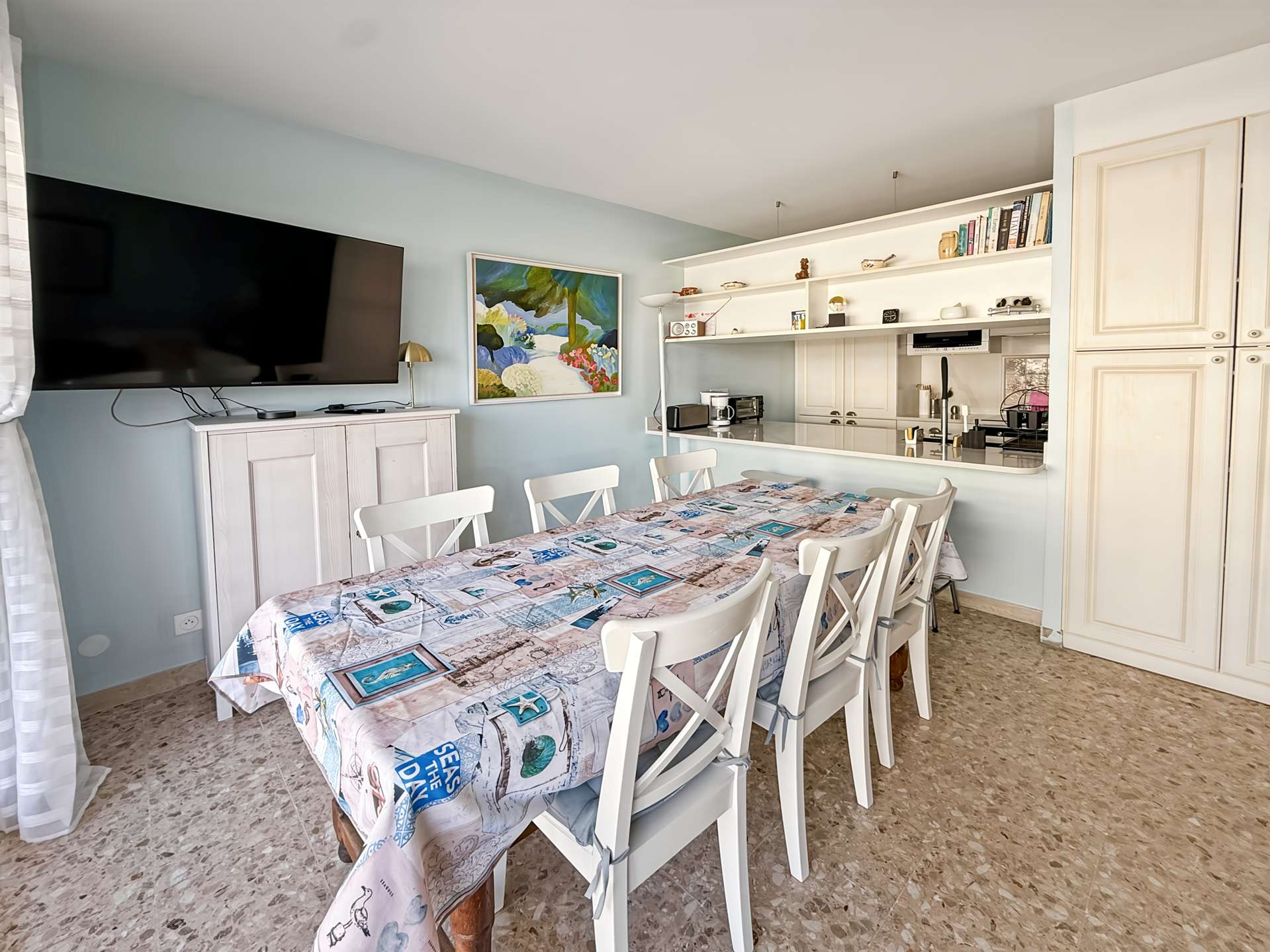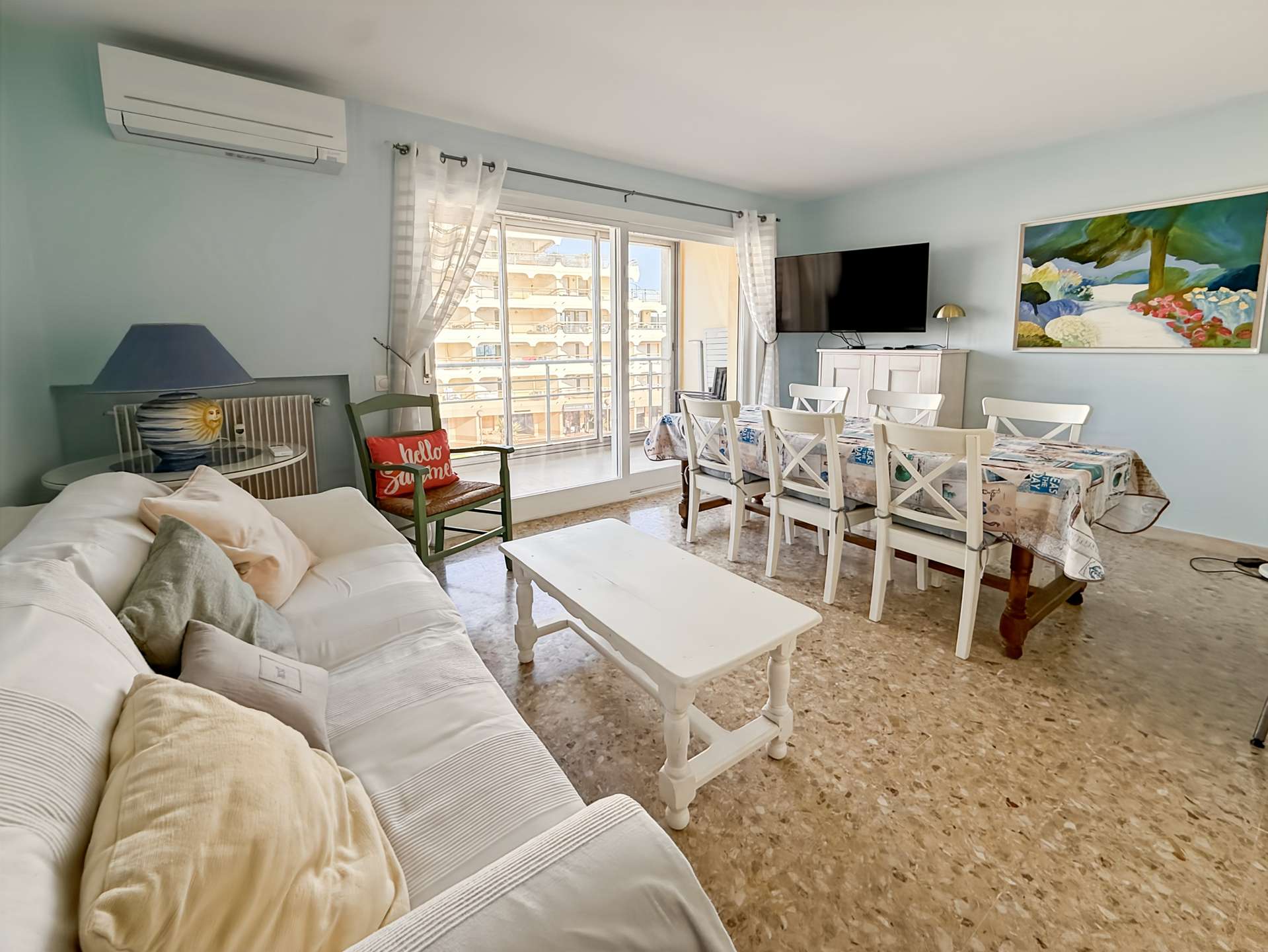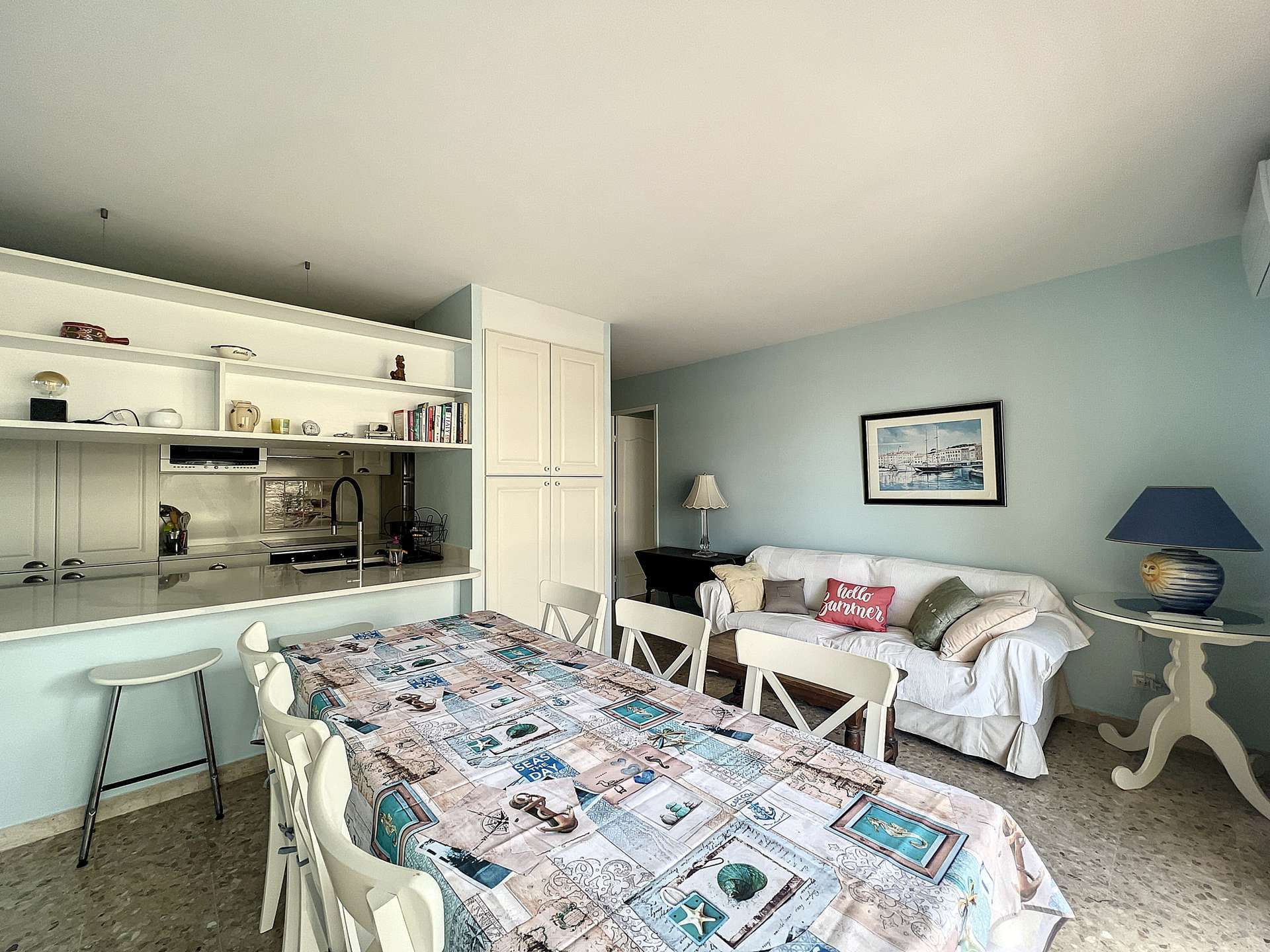 T2 Résidence bord de mer, ascenseur, garage. climatisation hall avec placard, séjour avec couchage, tv et accès a la terrasse, cuisine...